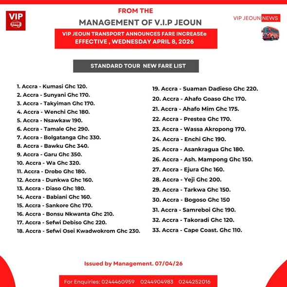 The company says the adjustment applies to both its standard tour and executive coach services across major routes from Accra to several destinations nationwide.