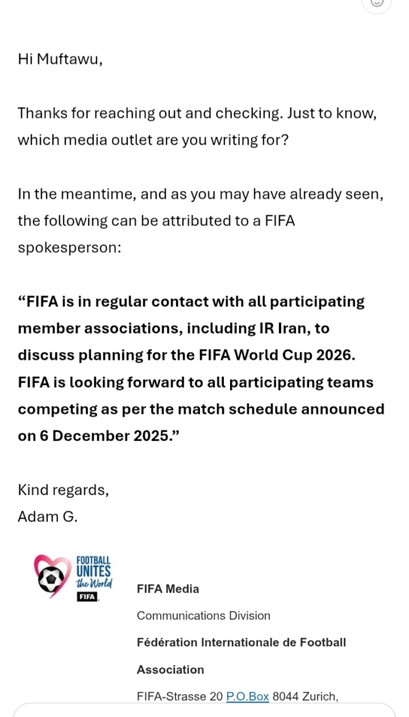 “FIFA is in regular contact with all participating member associations, including IR Iran, to discuss planning for the FIFA World Cup 2026. FIFA is looking forward to all participating teams competing as per the match schedule announced on 6 December 2025.”